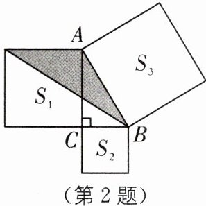 2. 如图,在Rt△ABC中,分别以这个三角形的三边为边长作正方形,面积分别记为$S_1、$$S_2、$$S_3,$若$S_1+S_3-S_2= 20,$则阴影部分面积为(