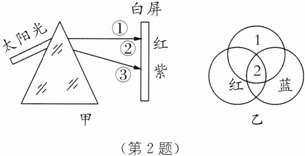2. 如图甲所示,让一束太阳光通过三棱镜射到白屏上,屏上标出了三个区域.其中人眼看不到又能显著产生热效应的是区域