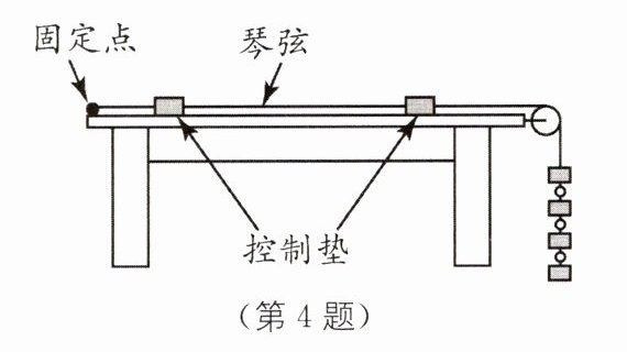 4. 小海想探究二胡演奏时,音调与琴弦松紧、长短、粗细的关系。他找来两根粗细不同的钢丝弦,设计了如图所示的装置,拨动控制垫间的琴弦,进行了四次对比探究,实验信息如表所示。