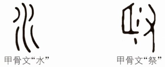 3. 《经典常谈》中《〈说文解字〉第一》提到汉字的造字法有形声、象形、指事、会意四种。在甲骨文中,“水”字形态似流动的水波;“祭”(见下图)左边像一块鲜肉,肉上还有血水流出,右边则像一只手。据此推测,“水”采用的应该是