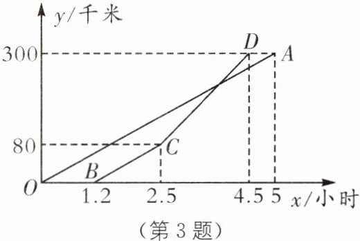 3. 甲、乙两地相距300千米,一辆货车和一辆轿车分别从甲地开往乙地(轿车的平均速度大于货车的平均速度),如图,线段OA和折线BCD分别表示两车离甲地的距离y(单位:千米)与时间x(单位:小时)之间的函数关系,则下列说法:①两车同时到达乙地;②轿车行驶过程中进行了提速;③货车出发3.9小时后,轿车追上货车;④两车在前80千米的速度相等。其中正确的个数是(
