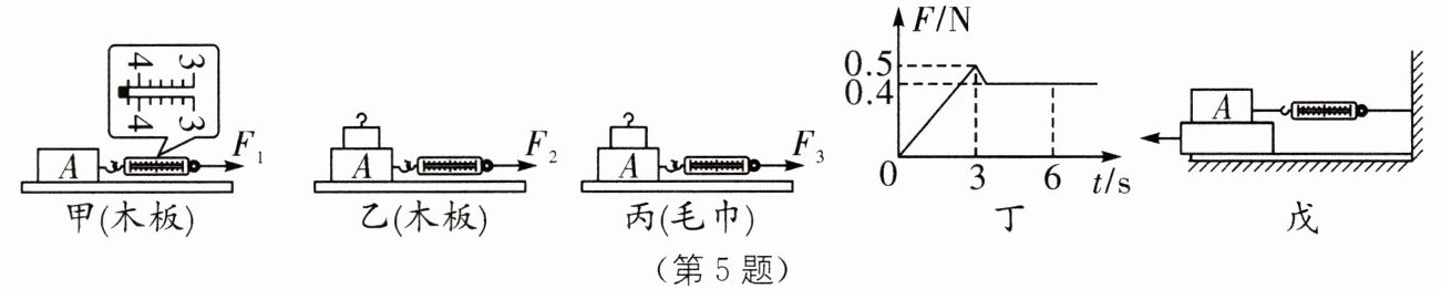 (4)在利用图甲装置进行实验时,拉动木块由静止到匀速直线运动过程中,弹簧测力计对木块的拉力F随时间t的变化图像如图丁所示,0~3s木块处于静止状态,3s后木块开始运动.分析图像可知,当木块所受拉力为0.4N时,木块处于