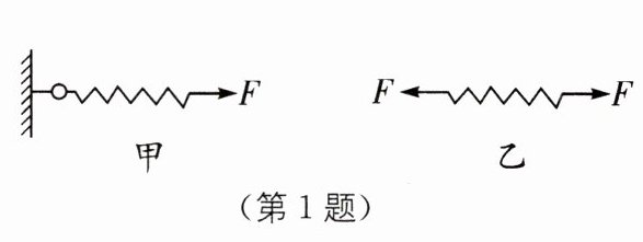 1. 如图甲所示,弹簧的一端挂在墙上,一人用4N的力F拉另一端,弹簧伸长了5cm;如图乙所示,两个人分别拉该弹簧的两端,弹簧也伸长了5cm,则每个人的拉力F分别为(