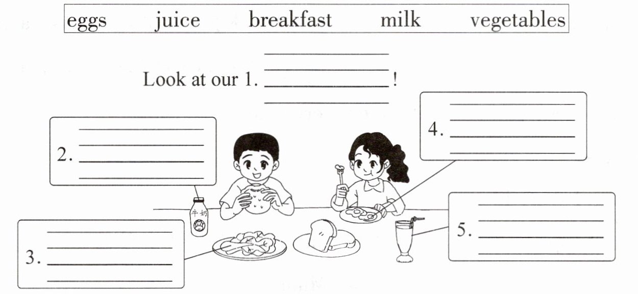1. breakfast 2. milk 3. vegetables 4. eggs 5. juice