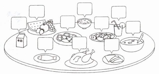 【解析】:本题可根据图片中展示的食物和饮品,结合所给单词序号及对应的食物、饮品名称,将序号填入相应的框内。考查对常见食物和饮品英文单词的认知。
