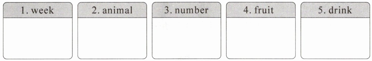 【解析】:本题可根据所给单词的词义,将其分别归类到“week(星期)”“animal(动物)”“number(数字)”“fruit(水果)”“drink(饮品)”这五个类别中。