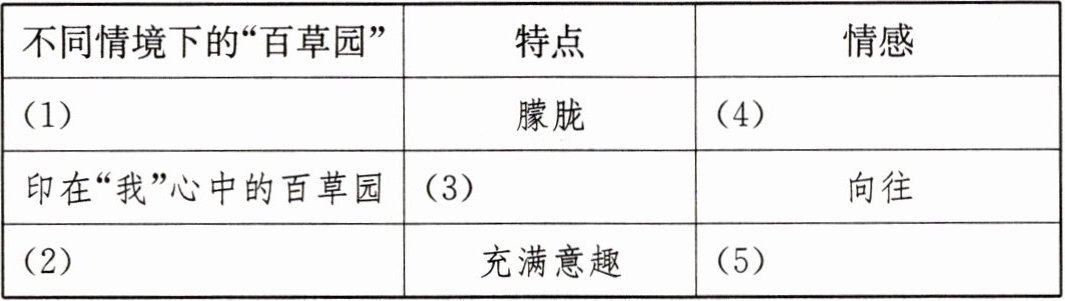 (1)月色下的百草园 (2)南坡生活中的百草园 (3)动人 (4)满足 (5)依恋