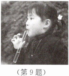9. 如图所示,在试管中加入少量水,用嘴对着试管口吹气,可使其发出声音.声音是由管内空气柱