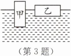 3. 如图所示,质地均匀的长方体木块,第一次如图甲所示直立浮在水面上,所受浮力为$F_{1}$,此时水对其底部的压强为$p_{1}$;第二次如图乙所示横浮在水面上,所受浮力为$F_{2}$,此时水对其底部的压强为$p_{2}$.则(