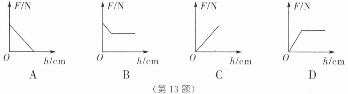 (8)如图所示是小明同学绘制的当物体浸入水中时弹簧测力计的示数$F随物体下表面到水面的距离h$变化的关系图像,其中正确的是