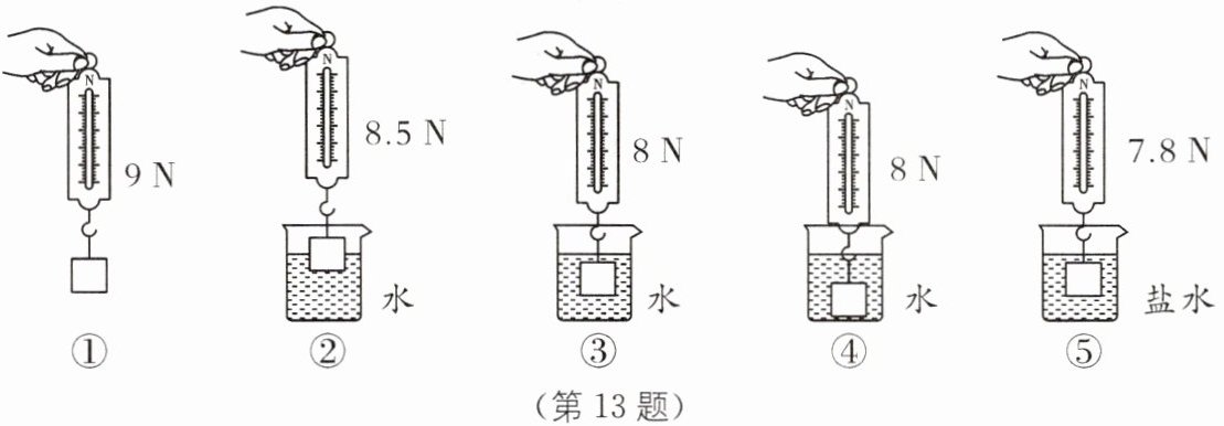 13. 在“探究浮力的大小跟哪些因素有关”的实验中,小明同学和他的小伙伴们做了如图所示的一系列实验.($\rho_{水}= 1.0× 10^{3}\ \text{kg/m}^{3}$)