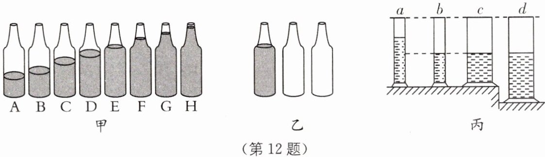 12. 如图甲所示,某小组的同学在8个相同的水瓶中灌入质量不同的水,水的高度不等.