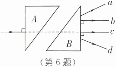 6. 如图所示,两块完全相同的直角三角形玻璃砖$A和B$放置在同一水平面内,斜边平行且相距一定距离. 一条光线从空气中垂直于玻璃砖$A$的直角边射入,从玻璃砖$B$的直角边射出,射出后的位置和方向可能是图中的(