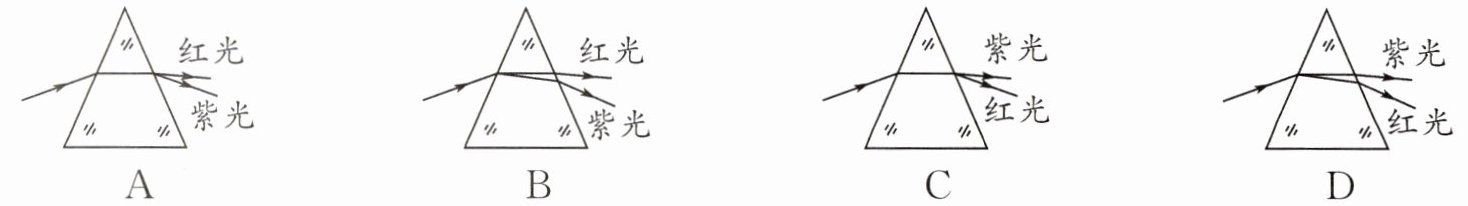 6. 光的色散说明白光是一种复色光,棱镜对不同色光的偏折程度不同,其中对红光的偏折程度最小,对紫光的偏折程度最大.下列图中能正确表示白光通过三棱镜发生色散的是(