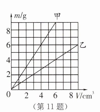 11. 小明在探究甲、乙两种不同物质的质量和体积的关系时,得出了如图所示的图像.由图像可知,甲、乙两种物质的密度之比$ρ_{甲}:ρ_{乙}=$