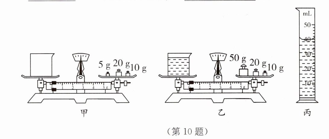 10. 如图所示是测量酱油密度的过程,从图甲可读出烧杯的质量,从图乙可读出烧杯和酱油的总质量,从图丙可读出烧杯中全部酱油的体积.那么,酱油的质量$m=$