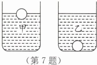 7. 如图所示,将一个由某种材料制成的空心球放入甲液体中,小球漂浮在液面上;若把它放入乙液体中,小球沉入杯底.则下列判断正确的是(