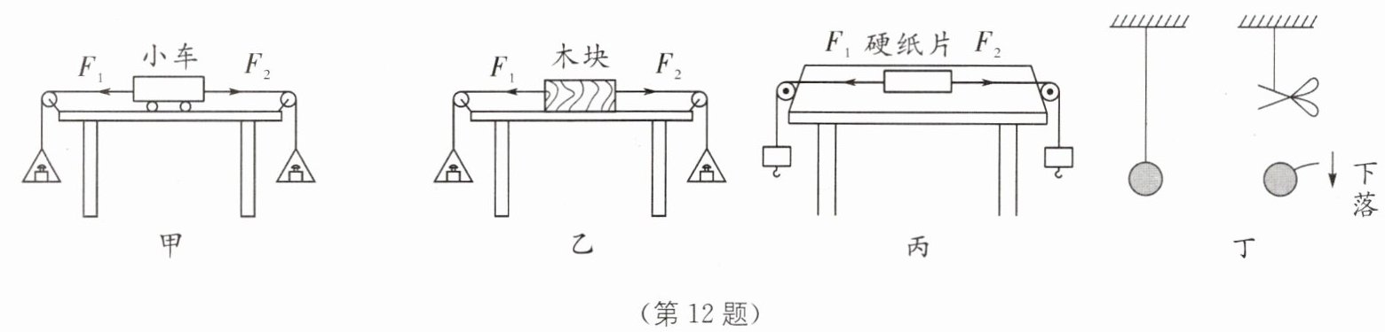 12. 某实验小组利用如图甲所示的实验装置做“探究二力平衡的条件”实验时,小海同学设计了如图乙所示的实验方案.
