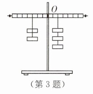 3. 如图所示,杠杆处于平衡状态,如果在杠杆两侧挂钩码处各增加一个质量相同的钩码,杠杆会(