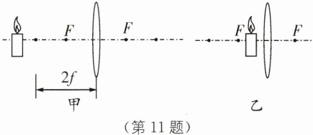11.照相机 放大镜 [解析]由图可知,图甲中 $ u > 2f $,成倒立、缩小的实像,$ 2f > v > f $,应用于照相机和摄像机;图乙中 $ u < f $,成正立、放大的虚像,应用于放大镜。