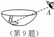 9. 如图所示,小明将一枚硬币放在碗底,眼睛在$A$处恰好看不到它;沿碗壁缓缓向碗中加水,小明在$A$处又能看到“硬币”,这是因为光从