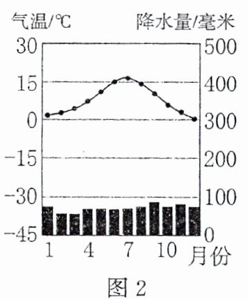 图1为欧洲西部大不列颠岛略图,图2为伦敦气温年变化曲线和逐月降水量图。读图,完成5~6题。