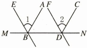 解:如果已知 $\angle 1 = \angle 2$,那么 $AB // CD$,不是真命题,添加条件为 $BE // DF$。