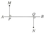 19. 如下图所示,一辆汽车在直线形的公路$AB$上由$A$向$B$行驶,$M$,$N$分别是位于公路$AB$两侧的村庄,设汽车行驶到点$P$位置时,离村庄$M$最近,行驶到点$Q$位置时,离村庄$N$最近,请你在$AB$上分别画出$P$,$Q$两点的位置.