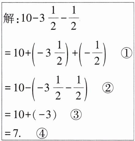 9 在计算“$10-3\frac {1}{2}-\frac {1}{2}$”时,甲同学的做法如下:
