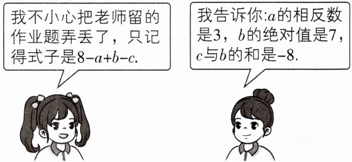 (2)因为 b=±7,c 与 b 的和是-8,所以当 b=7 时,c=-15,当 b=-7 时,c=-1. 当 a=-3,b=7,c=-15 时,8-a+b-c=8-(-3)+7-(-15)=33;当 a=-3,b=-7,c=-1 时,8-a+b-c=8-(-3)+(-7)-(-1)=5.