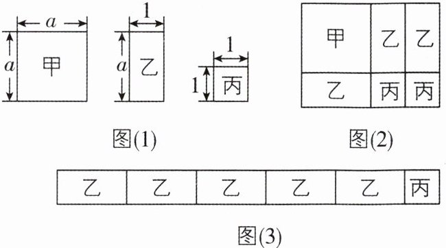 12 [2024 河北石家庄期末]现有甲、丙两种正方形和乙种长方形卡片各若干张,如图(1)所示($a > 1$).小明分别用 6 张卡片拼出了如图(2)和图(3)的两个长方形(不重叠且无缝隙),其面积分别为$S_1$,$S_2$.