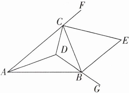 4 [2025浙江宁波期中,中]如图,在△ABC中,三个内角的平分线交于点D,其中∠CAB = n°,∠CBA = m°,延长AC至点F,延长DB至点G,∠FCB与∠CBG的平分线交于点E,若BE // AC,则$\frac{4}{7}n + \frac{3}{7}m = $