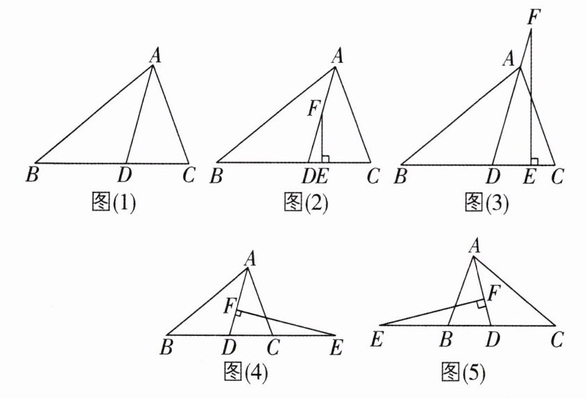 【拓展应用】(3)如图(4)、图(5),在△ABC中,∠ABC= α,∠ACB= β,AD是∠BAC的平分线,在直线AD上任取点F,过点F作EF⊥AD与直线BC交于点E,请求出∠DEF与α,β之间的数量关系.