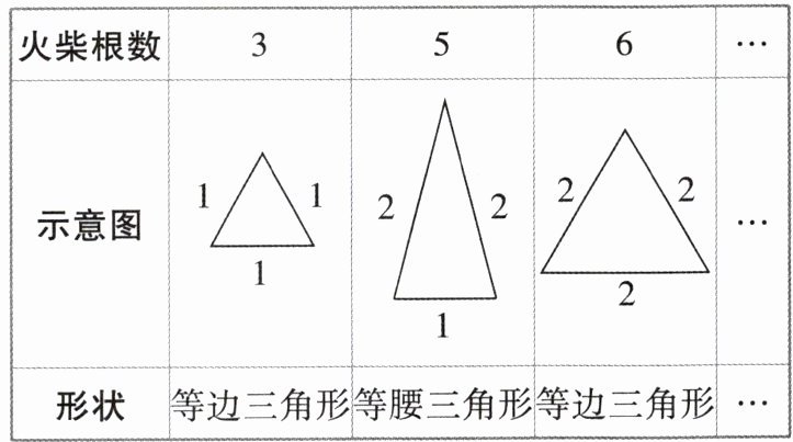 3 在平面内,分别用相同的 3 根,5 根,6 根,…火柴首尾顺次相接,能搭成什么形状的三角形呢? 通过尝试,列表如下: