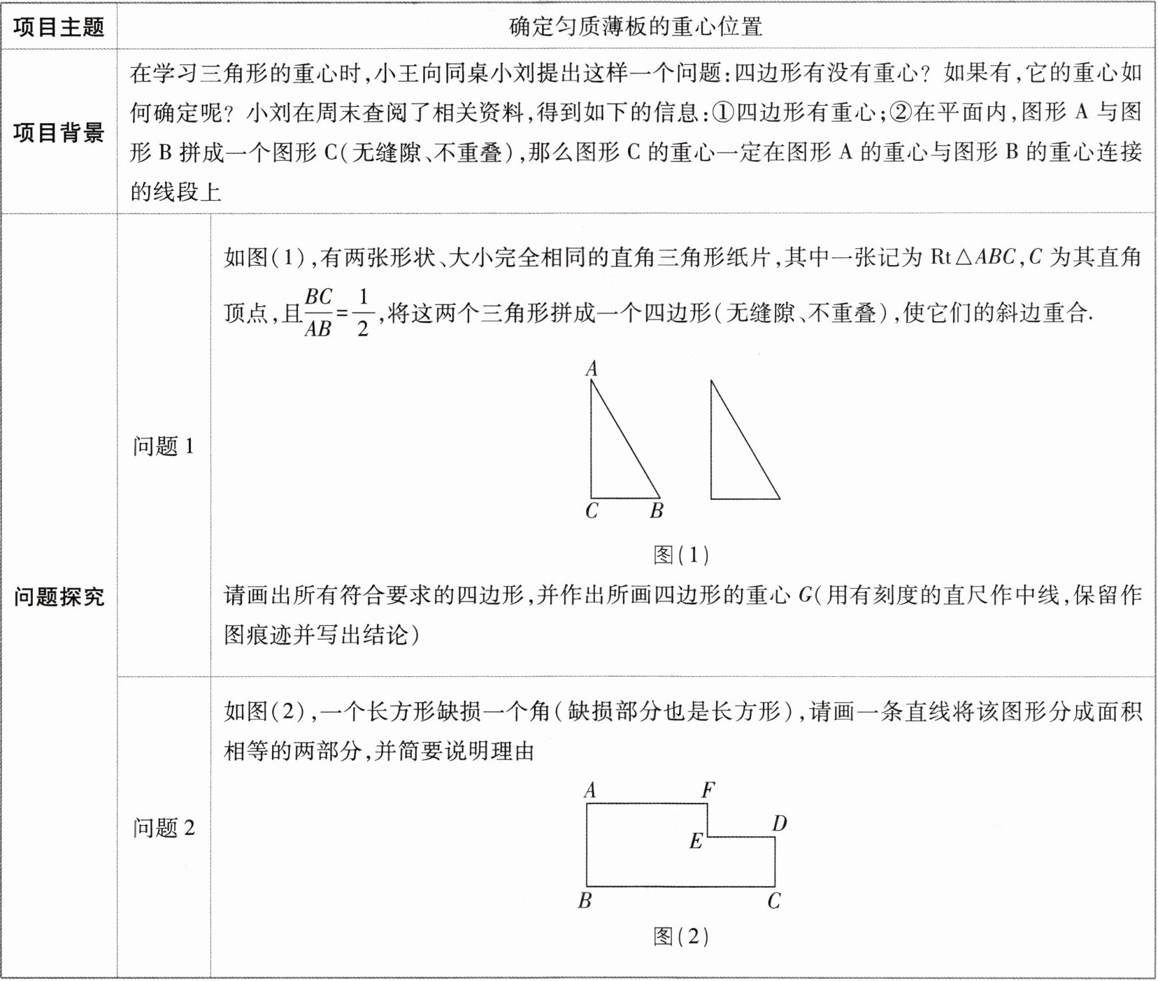 (1)所示,Rt△ABC的重心是其三条中线的交点E,Rt△ABD的重心是其三条中线的交点F.由题意可得,这两个完全相同的直角三角形拼成一个长方形ACBD,而这个长方形ACBD也可由△ACD和△BCD拼成,易知这两个三角形的重心都在AB上,则线段EF与AB的交点G就是长方形ACBD的重心.