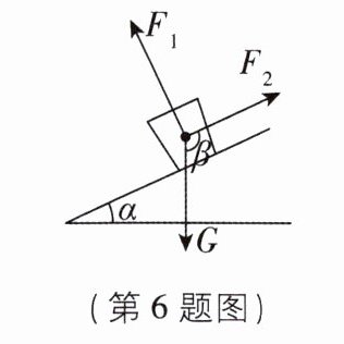 6新考向跨学科综合[2024山西中考]一只杯子静止在斜面上,其受力分析如图所示,重力G的方向竖直向下,支持力$F_1$的方向与斜面垂直,摩擦力$F_2$的方向与斜面平行.若斜面的坡角α= 25°,则摩擦力$F_2$与重力G方向的夹角β的度数为( )