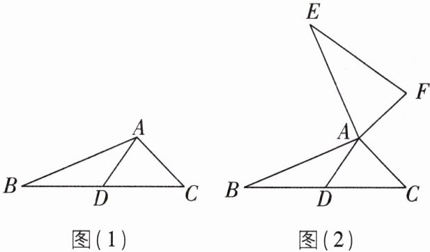 (2)如图(2),AD是△ABC的中线,AB= AE,AC= AF,∠BAE= ∠FAC= 90°,试探究线段AD与EF的数量和位置关系,并加以证明.