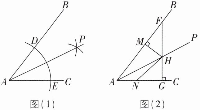 (2)在图(1)中射线AB上取一点F,过点F作$FG⊥AC$于点G,交射线AP于点H,过点H作$HM⊥AB$于点M,在AC上取一点N,使$NH= FH$,如图(2)所示.求证:$MF= GN$.