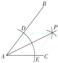 4[2025吉林松原质检,中]如图(1),以$∠BAC$的顶点A为圆心,适当长为半径画弧,交AB于点D,交AC于点E,分别以点D,E为圆心,大于$\frac {1}{2}DE$的长为半径画弧,两弧在$∠BAC$的内部相交于点P,画射线AP.