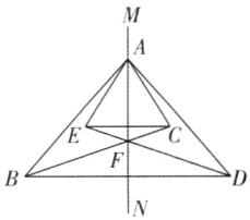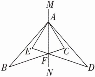 7 [2024 陕西西安质检] 如图,△ABC 和△ADE 关于直线 MN 对称,BC 和 DE 的交点 F 在直线 MN 上.