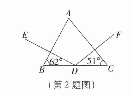 2 [2024 辽宁本溪期中,中] 如图,△ABC 中,D 点在 BC 上,分别以 AB,AC 所在直线为对称轴,画出点 D 的对称点 E,F,并连接 DE,DF. 根据图中标示的数据,求得∠EDF 的度数为 ( )