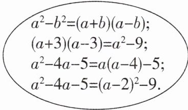 A 【解析】$a^{2}-b^{2}=(a+b)(a-b)$是因式分解;$(a+3)(a-3)=a^{2}-9$是整式的乘法,不是因式分解;$a^{2}-4a-5=a(a-4)-5$,等式的右边不是几个整式的乘积的形式,不是因式分解;$a^{2}-4a-5=(a-2)^{2}-9$,等式的右边不是几个整式的乘积的形式,不是因式分解.所以是因式分解的有1个.故选A.