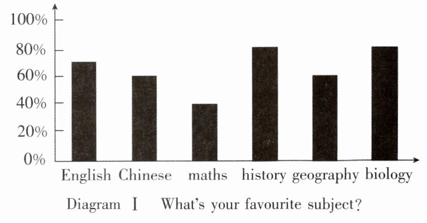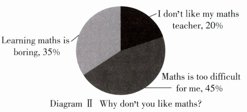 From Diagram Ⅰ, we can know that maths is the least popular (最不受欢迎的) subject in school. Why is that? We did a second survey of the students whose favourite subject is not maths and the results are shown in Diagram Ⅱ.