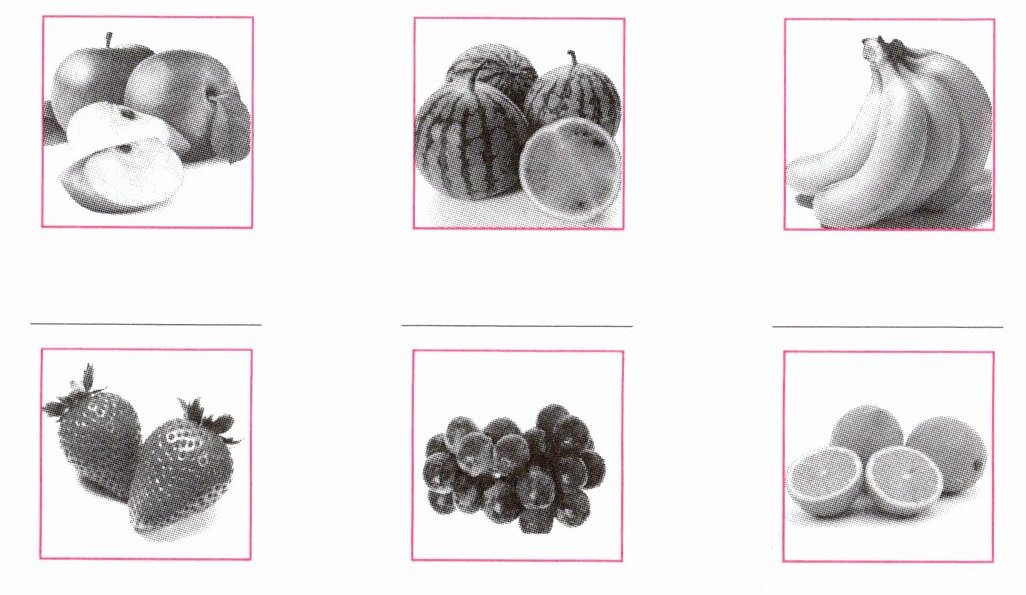 1. an apple 2. a rabbit 3. a mouse 4. grapes