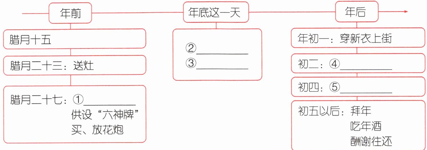 1. 时间 ①烧祭品 ②吃年夜饭 ③分送压岁钱 ④来往拜年 ⑤晚上接财神
