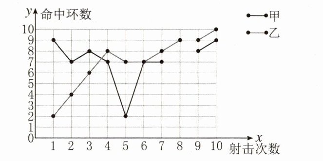 19. 为了从甲、乙两名选手中选拔一个参加射击比赛,现对他们进行一次测验,两个人在相同条件下各射靶 10 次.为了比较两人的成绩,制作了如下统计图表: