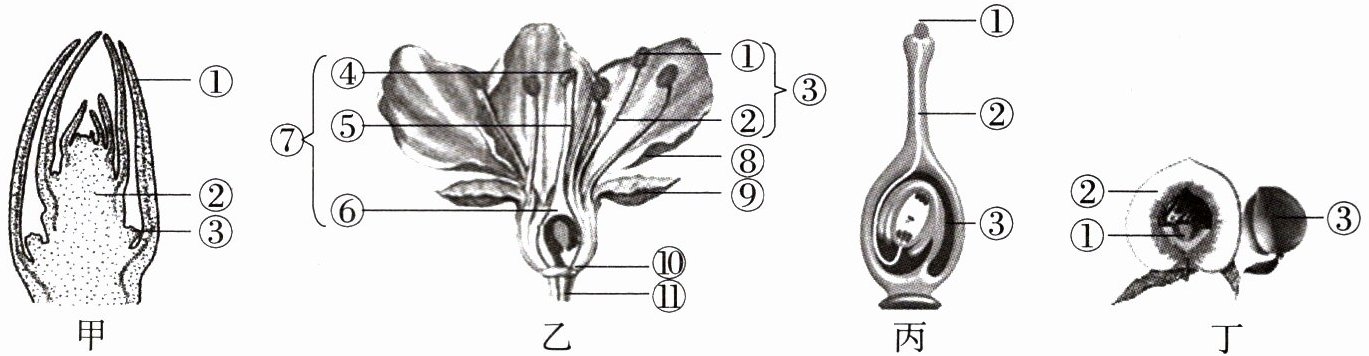 (最终确定,按图中标识及标准答案要求,第(4)小题丁图③种子由乙图⑥胚珠发育,丁图①果皮由乙图⑥子房壁发育,故答案如下:)