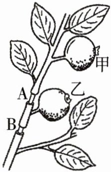 5. 右图是果树的一段枝条,长有大小相同的甲、乙两个果实,已对枝条的A、B两个部位的树皮进行了环剥。下列分析正确的是(