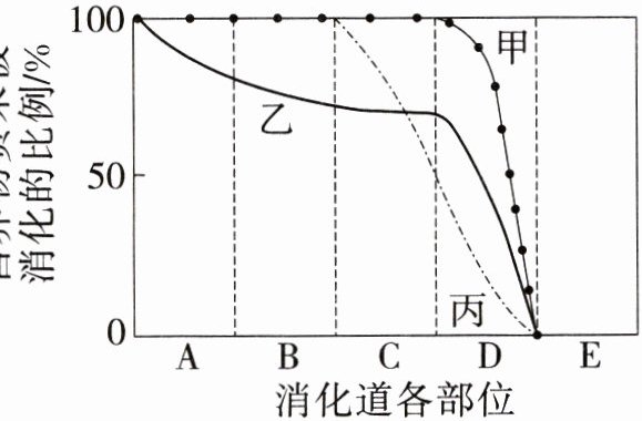 10. 鱼粉是用新鲜的鱼肉和米粉制作的一种美食,它软滑爽口,鲜美细腻,是备受人们青睐的美食之一。右图中的曲线甲、乙、丙表示食物中不同营养成分在消化道中各部位(依次用A、B、C、D、E表示)被消化的程度。请据图回答下列问题: