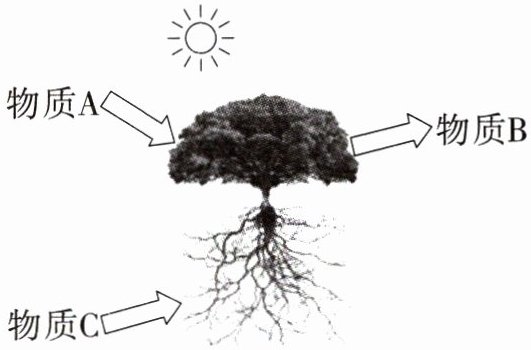 3. 如图是某种植物的外形示意图,图中箭头表示该植物在太阳光下进行光合作用时吸收和放出的物质,那么物质A、B、C分别代表的是(